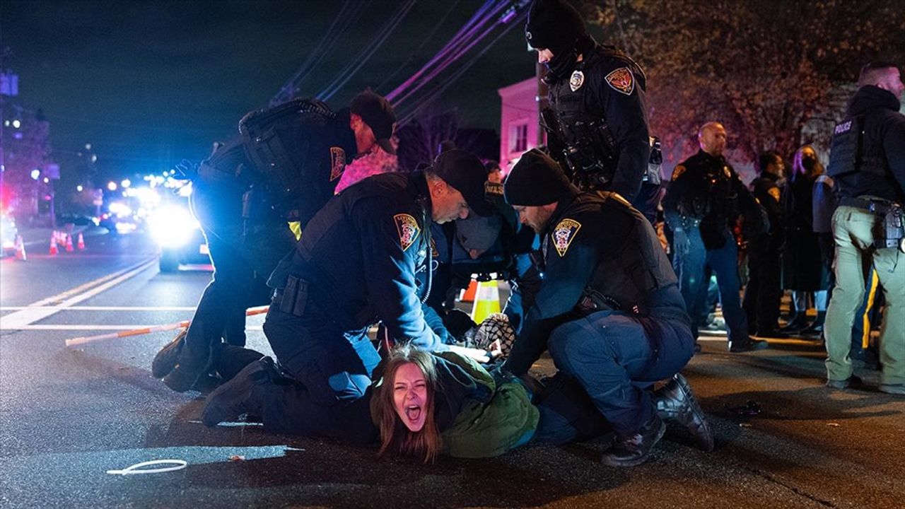 'Çocukları koruyun, Gallant'ı tutuklayın' ve 'Gallant soykırımdan suçlu' gibi yazıların bulunduğu dövizler taşıyan ve 'Özgür Filistin' sloganları atan göstericilerin yolu kapatması üzerine polis, kalabalığa müdahale etti.