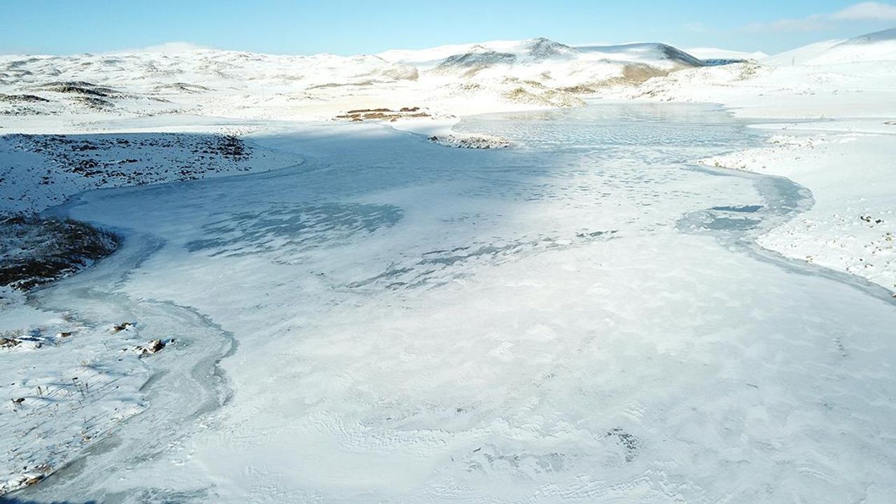 Çevresi karlı dağlarla kaplı olan ve güzel manzara oluşturan barajın buzla kaplı yüzeyi dronla görüntülendi.