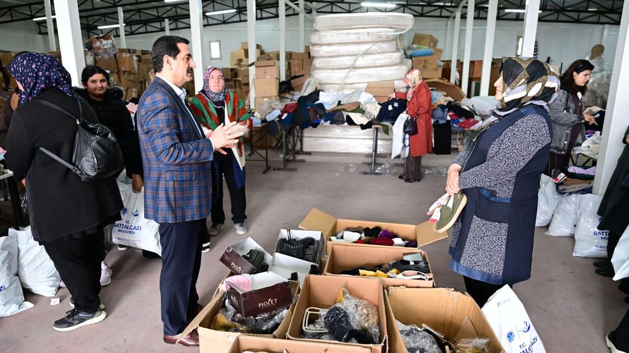Battalgazi Belediye Başkanı Bayram Taşkın, Sosyal Hizmetler Müdürlüğü Lojistik Deposu'nda Ak Parti Battalgazi İlçe Kadın Kolları Mahalle Başkanlarıyla birlikte gerçekleştirilen yardım malzemesi tasnif çalışmalarına eşlik etti.