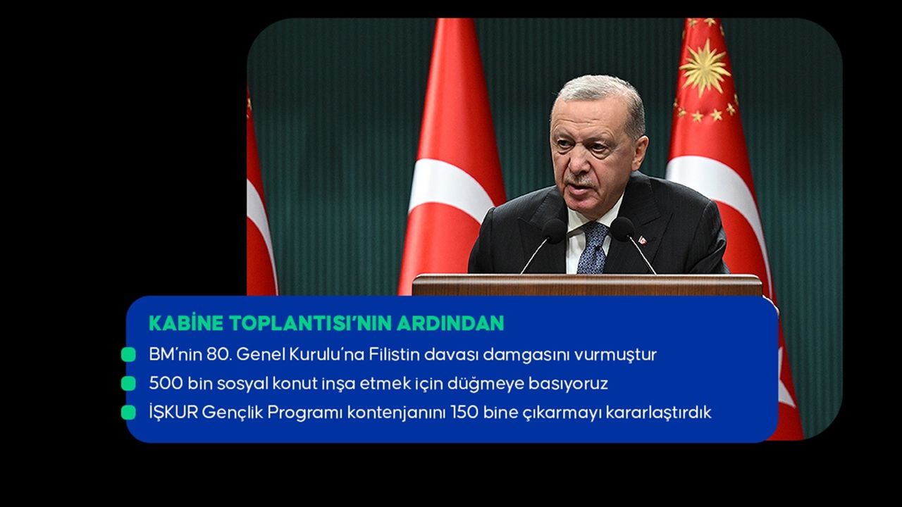 Erdoğan, ertesi gün BM Genel Kurulu'na hitap ettiğini belirterek, 'Hitabımızda, Gazze'de yaşanan ve artık soykırım boyutunu aşıp 'toplu kıyıma' evrilen vahşete vurgu yaptık. Gazzeli kardeşlerimizin 23 aydır kesintisiz maruz kaldığı zulmü rakamlarla fotoğraflarla ortaya koyduk. Uluslararası toplumu, İsrail'in Filistin halkına uyguladığı barbarlıklara karşı harekete geçmeye çağırdık.' diye konuştu.