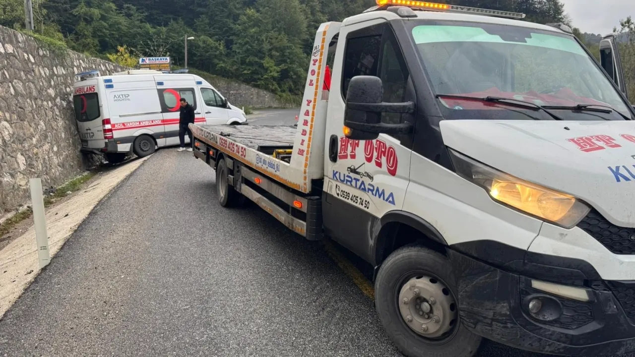 Ambulans, çekici yardımıyla bulunduğu yerden kaldırılırken, kazanın ardından yol güvenliği sağlandı.