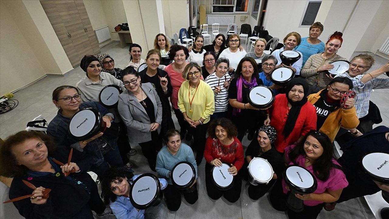 Ellerindeki darbuka ve zilli tef gibi enstrümanlar ve kaşıklarla haftanın iki günü belediye tarafından kendilerine gösterilen alanda çalışmalarını yapan kadınlar, çalan müziğe ritim tutup hem çalıyor hem de söylüyor.