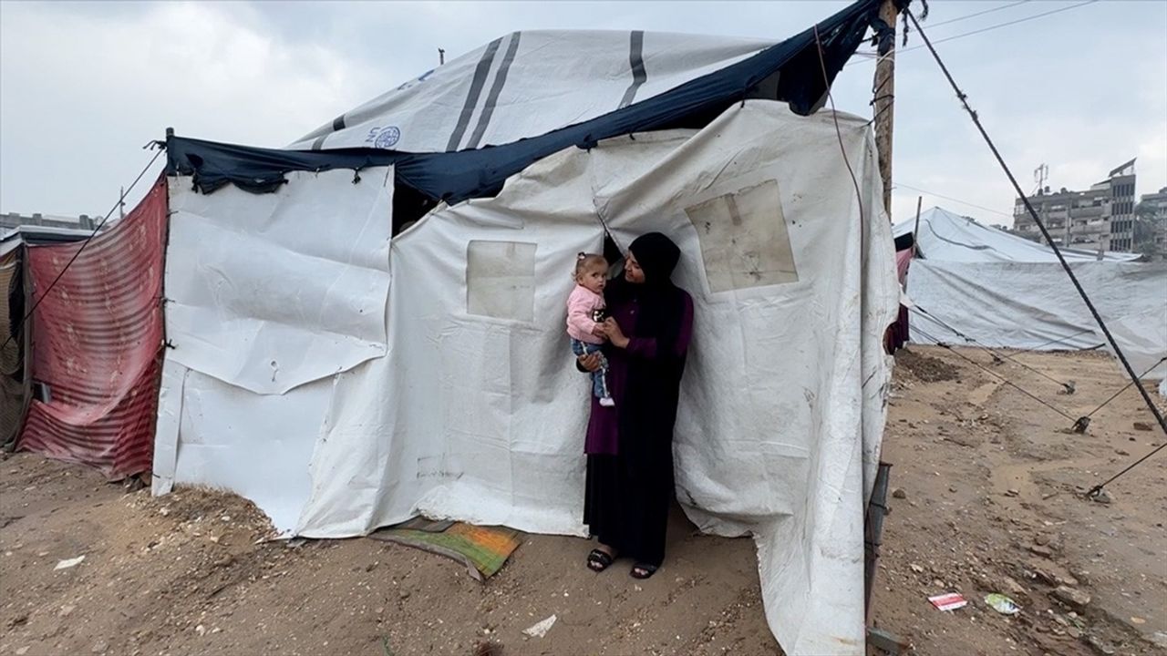 'Çadırda kış bizi çok zorluyor. Yere serecek bir şeyimiz olmadığı için zemin kayıyor. Yağmur da yağınca kayganlaşıyor, ne abdest alabiliyoruz ne namaz kılabiliyoruz ne ayakta durabiliyoruz. Sürekli bu vaziyette oturuyoruz.'