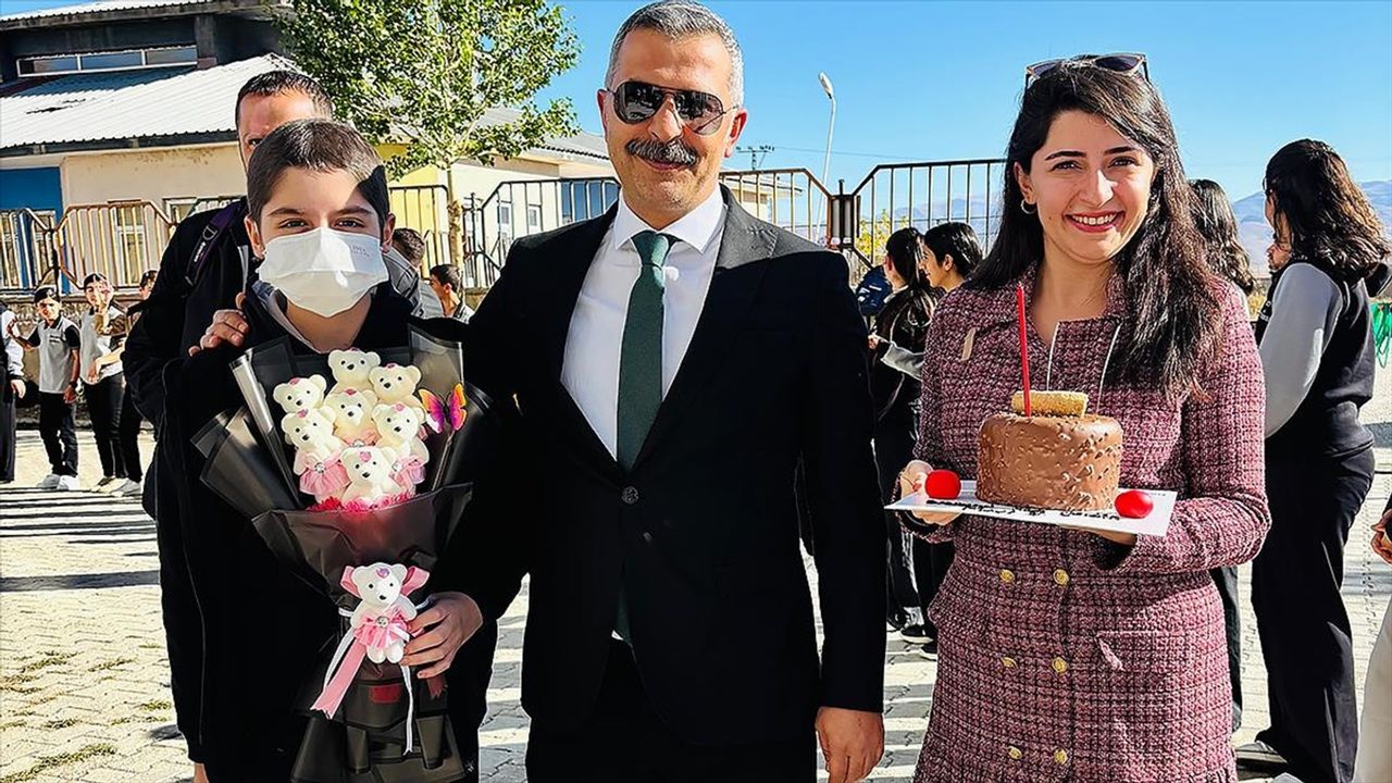 Öğrencilerin oluşturduğu kortejin arasından alkışlar eşliğinde okulun bahçesine gelen Aktan, burada öğretmenleri ve arkadaşları tarafından pasta ve çiçeklerle karşılandı.