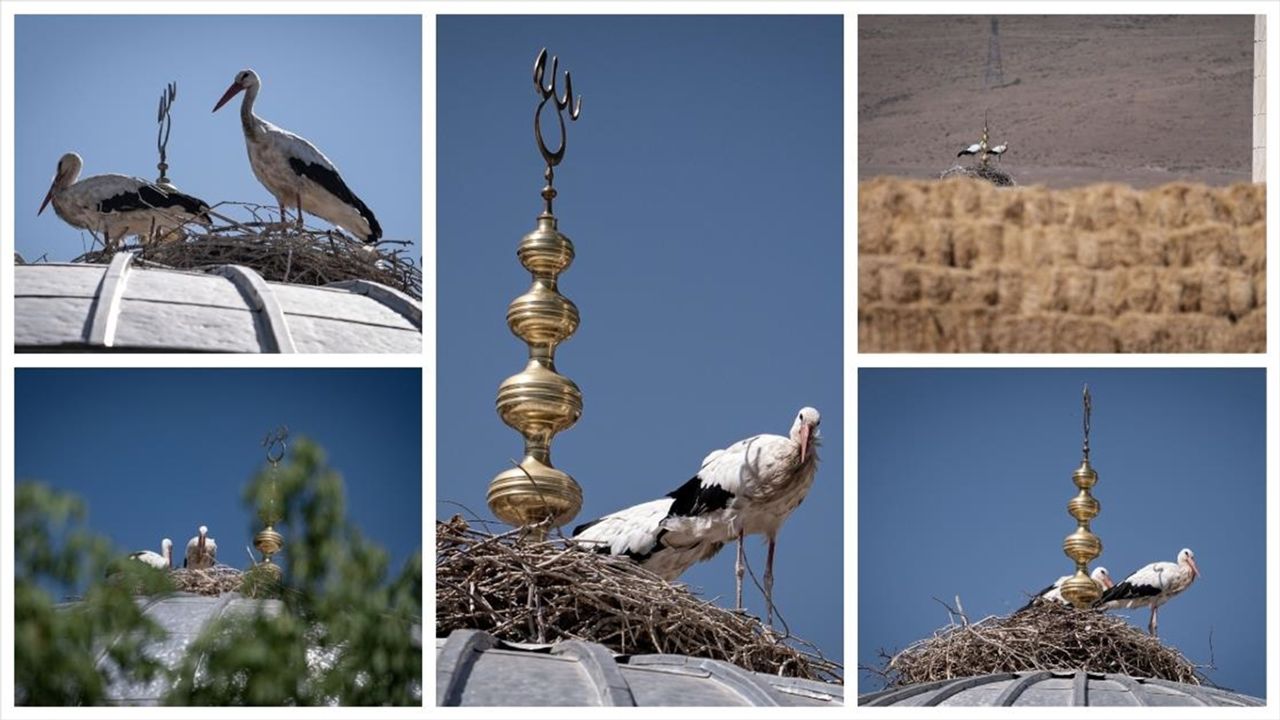 ERZURUM (AA) - Erzurum'un Aziziye ilçesine bağlı kırsal mahalleye gelen leylekler cami kubbesindeki 'alem'in altına yıllardır yuva yapıyor.