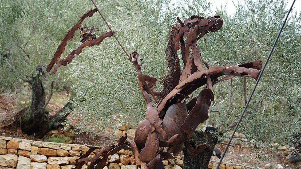 Nsaar'ın, yıllar içinde topladığı şarapnel, mermi kovanı, füze parçaları ve tank zırhı kırıkları gibi metal kalıntıları şekillendirerek oluşturduğu eserler, barış ve yaşamı simgeliyor.