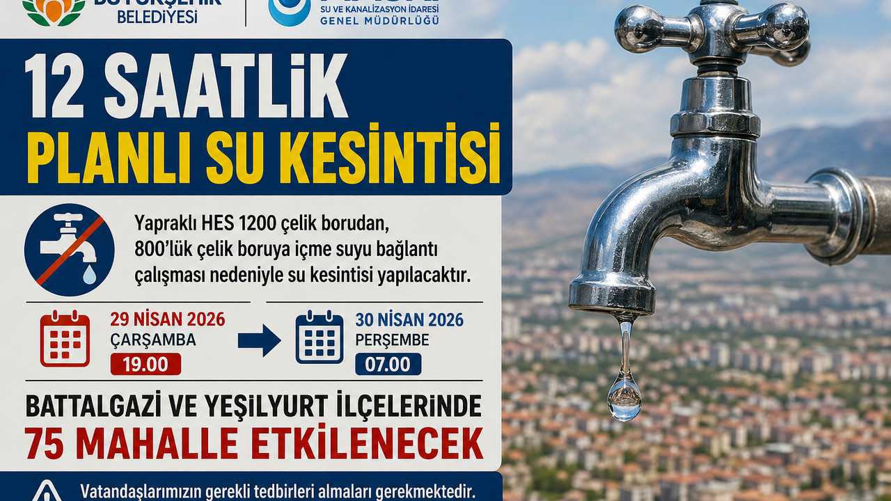 Malatya Büyükşehir Belediyesi Su ve Kanalizasyon İdaresi (MASKİ) Genel Müdürlüğü, Battalgazi ve Yeşilyurt ilçelerinde toplam 75 mahalleyi kapsayan 12 saatlik planlı su kesintisi yapılacağını duyurdu.