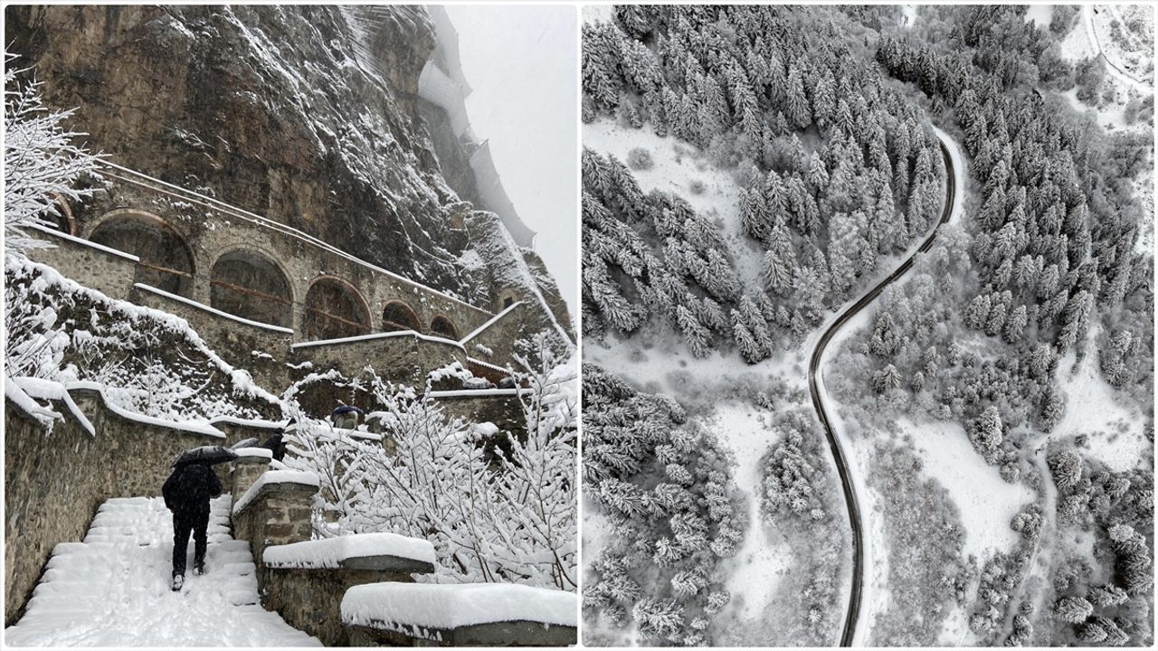 Karadağ'ın Altındere Vadisi'ne bakan eteğinde, vadiden yaklaşık 300 metre yükseklikteki ormanlık alanda kayalar oyularak yapılmış ve halk arasında 'Meryem Ana' adıyla bilinen Sümela Manastırı da etkili yağışın ardından beyaza büründü.