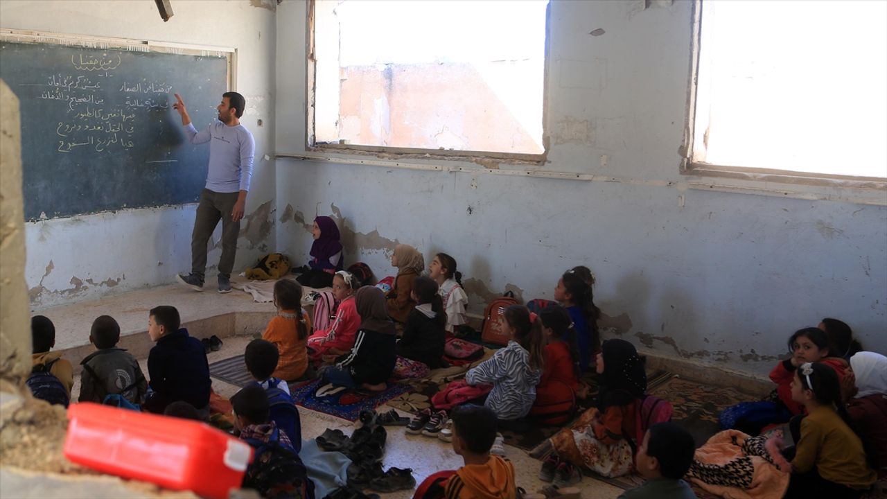İDLIB (AA) - İdlib'in güneyinde yer alan Maar Şımarin köyündeki okullarda, çatışmaların yıkıcı etkileri hala hissediliyor. Sıraları, kapı ve pencereleri olmayan, duvarları hasar gören sınıflarda öğrenciler, soğuk zeminlerde oturarak ders yapıyor.