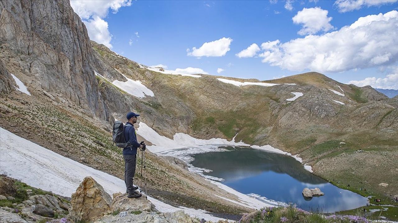 Zirveye doğru tırmanan doğaseverler, 2 saatlik yürüyüşün sonunda Buyer Gölü'ne ulaşıp ilkbahar ve kış manzaralarını bir arada yaşıyor.