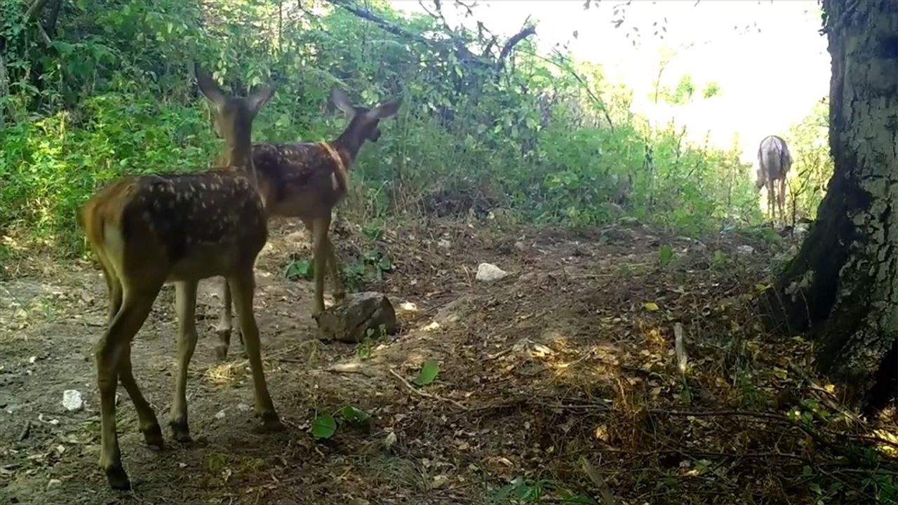 Uludağ'da ormana kurulan fotokapan tarafından kaydedilen görüntülerde, kızıl geyik ve 2 yavrusunun ağaçların altında yürüdüğü anlar yer aldı.